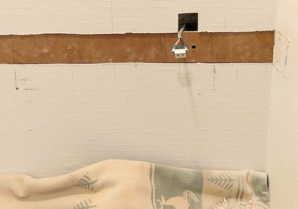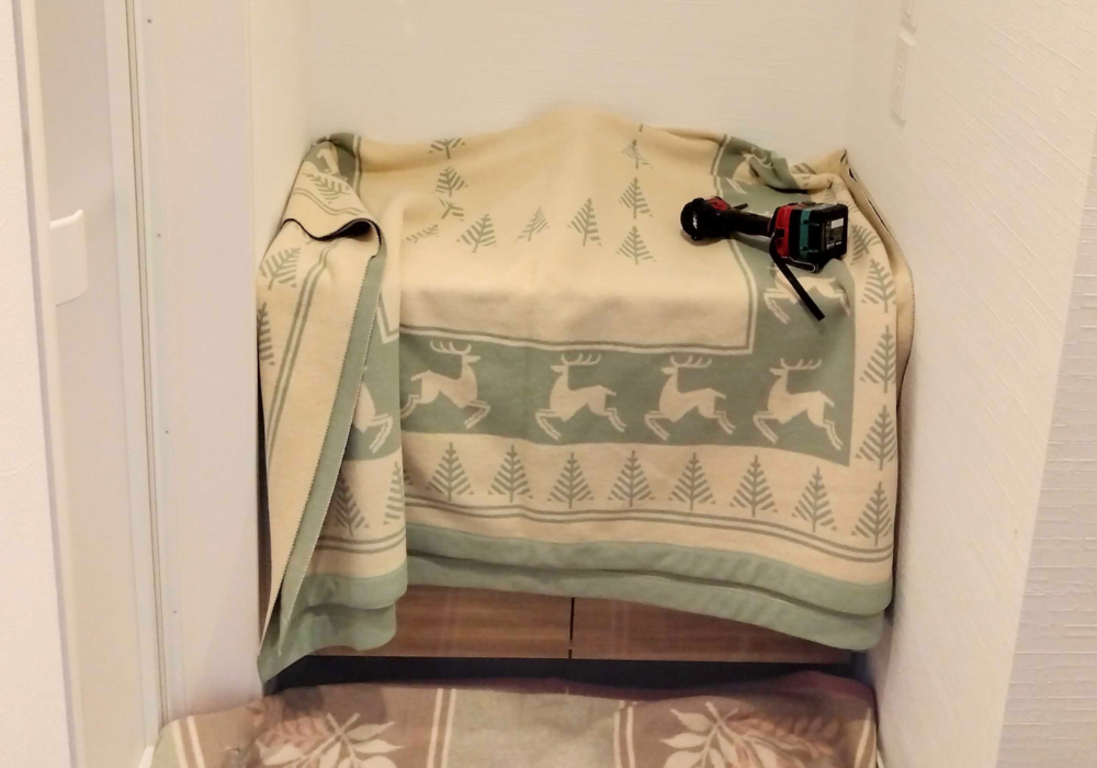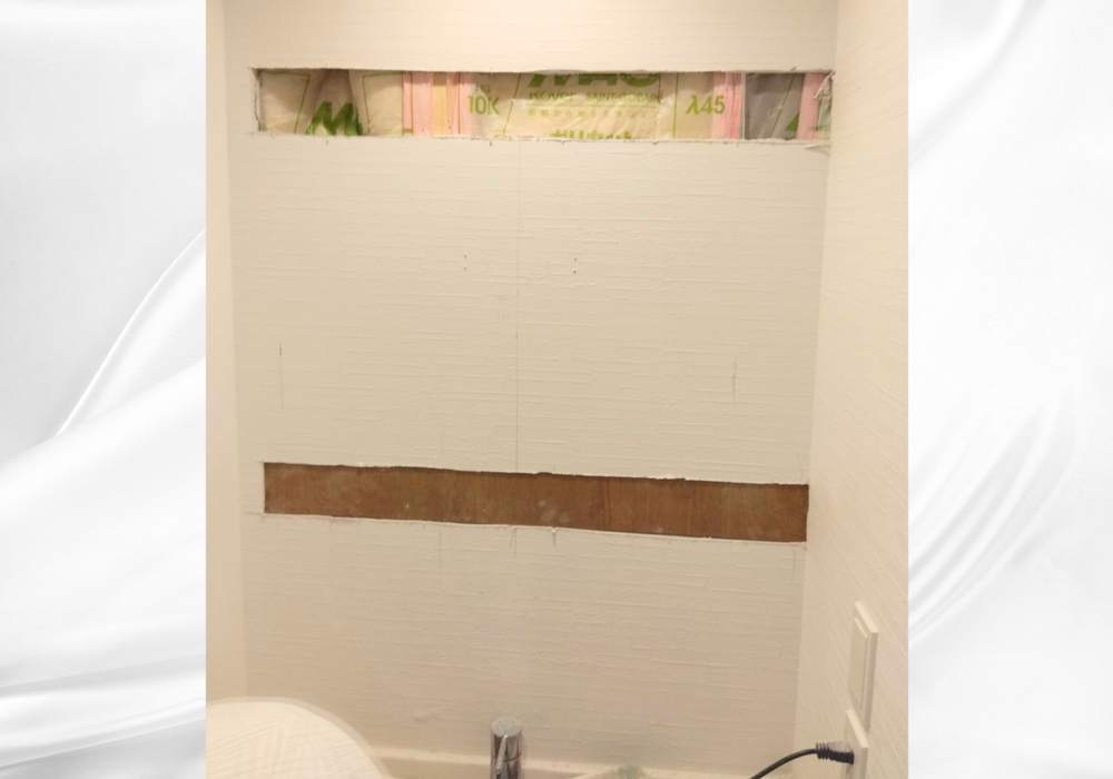 既存洗面台に対し、ミラーキャビネットを新設していきます。